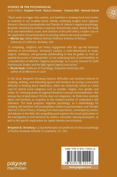 In this book, Benjamin Strosberg explores difficulties and anxieties inherent in studying, defining, and defending against anti-Semitism by tracing a concurrent difficulty in thinking about Jewishness, which has historically served as a limit case for central social categories such as outsider, religion, race, gender, and nation. Dr. Strosberg draws on Zygmunt Bauman's concept of proteophobia-the anxious fear of what doesn't fit into clear-cut categories-to think more carefully about anti-Semitism as response to the complex-realities of ambivalence and otherness. The book proposes 'negative psychology' as a methodology for studying anti-Semitism and proteophobia rooted in psychoanalysis and Theodor Adorno's Critical Theory. Drawing from lived experiences, contemporary events, and debates in the field, this compelling work explores the broad implications of the investigation of anti-Semitism for politics, education, and psychoanalysis, as well as the specific implications for Jewish identity and resistance.