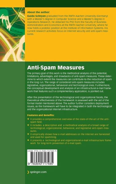 From the reviews: "Schryen's book basically contains his German habilitation dissertation. ... This work is a methodical analysis of the potential, limitations, advantages, and drawbacks of antispam measures. ... In summary, Schryen provides a comprehensive overview of the state of the art of the antispam field. An excellent work for those working in this field. Summing Up: Highly recommended. Faculty; researchers; professionals." (C. Tappert, CHOICE, Vol. 45 (6), 2008) "This book investigates the problem of email spam ... . It is well written and important concepts ... are exhaustively outlined along with relevant code headers and sensible discussions. I was actually very impressed with the work here and once I started to delve into the contents of this book, I did discover a lot more about this field ... . a tour de force of anti-spam measures and I would hope that this book will become a bedtime read for researchers in the field." (Kevin Curran, Informer, Issue 26, Spring, 2008) "This book ... reviews the history of spam, assesses the current situation and the economic significance of spam, analyzes current anti-spam measures, and proposes changes to the email infrastructure framework to address spam. ... Anyone frustrated by spam will find the book to be an excellent reference ... . The book is a timely review of the current state of spam email on the Internet. It contains thorough references, several appendices, and a good index." (David B. Henderson, ACM Computing Reviews, January, 2009)