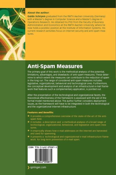 "Schryen's book basically contains his German habilitation dissertation. ... This work is a methodical analysis of the potential, limitations, advantages, and drawbacks of antispam measures. ... In summary, Schryen provides a comprehensive overview of the state of the art of the antispam field. An excellent work for those working in this field. Summing Up: Highly recommended. Faculty; researchers; professionals." (C. Tappert, CHOICE, Vol. 45 (6), 2008)