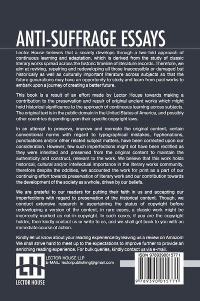 Anti-Suffrage Essays: By Massachusetts Women With An Introduction By Ernest Bernbaum This book is a result of an effort made by us towards making a contribution to the preservation and repair of original classic literature. In an attempt to preserve, improve and recreate the original content, we have worked towards: 1. Type-setting & Reformatting: The complete work has been re-designed via professional layout, formatting and type-setting tools to re-create the same edition with rich typography, graphics, high quality images, and table elements, giving our readers the feel of holding a 'fresh and newly' reprinted and/or revised edition, as opposed to other scanned & printed (Optical Character Recognition - OCR) reproductions. 2. Correction of imperfections: As the work was re-created from the scratch, therefore, it was vetted to rectify certain conventional norms with regard to typographical mistakes, hyphenations, punctuations, blurred images, missing content/pages, and/or other related subject matters, upon our consideration. Every attempt was made to rectify the imperfections related to omitted constructs in the original edition via other references. However, a few of such imperfections which could not be rectified due to intentional\unintentional omission of content in the original edition, were inherited and preserved from the original work to maintain the authenticity and construct, relevant to the work. We believe that this work holds historical, cultural and/or intellectual importance in the literary works community, therefore despite the oddities, we accounted the work for print as a part of our continuing effort towards preservation of literary work and our contribution towards the development of the society as a whole, driven by our beliefs. We are grateful to our readers for putting their faith in us and accepting our imperfections with regard to preservation of the historical content. HAPPY READING!
