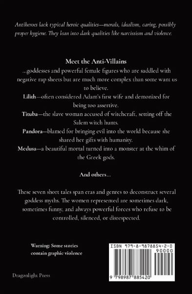 Antiheroes lack typical heroic qualities-morals, idealism, caring, possibly proper hygiene. They lean into dark qualities like narcissism and violence. Meet the Anti-Villains ...goddesses and powerful female figures who are saddled with negative rap sheets but are much more complex than some want us to believe. Lilith-often considered Adam's first wife and demonized for being too assertive.Tituba-the slave woman accused of witchcraft, setting off the Salem witch hunts.Pandora-blamed for bringing evil into the world because she shared her gifts with humanity.Medusa-a beautiful mortal turned into a monster at the whim of the Greek gods. And others... These seven short tales span eras and genres to deconstruct several goddess myths. The women represented are sometimes dark, sometimes funny, and always powerful forces who refuse to be controlled, silenced, or disrespected. Warning: Some stories contain graphic violence.