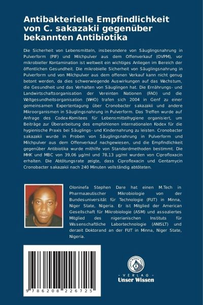 Die Sicherheit von Lebensmitteln, insbesondere von Säuglingsnahrung in Pulverform (PIF) und Milchpulver aus dem Offenverkauf (OVPM), vor mikrobieller Kontamination ist weltweit ein wichtiges Anliegen im Bereich der öffentlichen Gesundheit. Die mikrobielle Sicherheit von Säuglingsnahrung in Pulverform und von Milchpulver aus dem offenen Verkauf kann nicht genug betont werden, da dies schwerwiegende Auswirkungen auf das Wachstum, die Gesundheit und das Verhalten von Säuglingen hat. Die Ernährungs- und Landwirtschaftsorganisation der Vereinten Nationen (FAO) und die Weltgesundheitsorganisation (WHO) trafen sich 2004 in Genf zu einer gemeinsamen Expertentagung über Cronobacter sakazakii und andere Mikroorganismen in Säuglingsnahrung in Pulverform. Das Treffen wurde auf Anfrage des Codex-Komitees für Lebensmittelhygiene organisiert, um Beiträge zur Überarbeitung des empfohlenen internationalen Kodex für die hygienische Praxis bei Säuglings- und Kindernahrung zu leisten. Cronobacter sakazakii wurde in Proben von Säuglingsnahrung in Pulverform und Milchpulver aus dem Offenverkauf nachgewiesen, und die Empfindlichkeit gegenüber Antibiotika wurde mithilfe von Standardmethoden bestimmt. Die MHK und MBC von 39,06 µg/ml und 78,13 µg/ml wurden von Ciprofloxacin erhalten. Die Abtötungsrate zeigte, dass Ciprofloxacin und Gentamycin Cronobacter sakazakii nach 240 Minuten vollständig abtöteten.