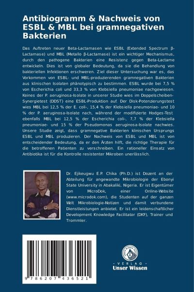 Das Auftreten neuer Beta-Lactamasen wie ESBL (Extended Spectrum beta-Lactamase) und MBL (Metallo beta-Lactamase) ist ein wichtiger Mechanismus, durch den pathogene Bakterien eine Resistenz gegen Beta-Lactame entwickeln. Dies ist von globaler Bedeutung, da sie die Behandlung von bakteriellen Infektionen erschweren. Ziel dieser Untersuchung war es, das Vorkommen von ESBL- und MBL-produzierenden gramnegativen Bakterien aus klinischen Isolaten phänotypisch zu bestimmen. ESBL wurde bei 7,5 % von Escherichia coli und 33,3 % von Klebsiella pneumoniae nachgewiesen. Keines der P. aeruginosa-Isolate in unserer Studie wies im Doppelscheiben-Synergietest (DDST) eine ESBL-Produktion auf. Der Disk-Potenzierungstest wies MBL bei 12,5 % der E. coli-, 15,4 % der Klebsiella pneumoniae- und 10 % der P. aeruginosa-Isolate nach, während der modifizierte Hodges-Test ebenfalls MBL bei 12,5 % der Escherichia coli-, 7,7 % der Klebsiella pneumoniae- und 15 % der Pseudomonas aeruginosa-Isolate nachwies. Unsere Studie zeigt, dass gramnegative Bakterien klinischen Ursprungs ESBL und MBL produzieren. Der Nachweis von ESBL und MBL ist von entscheidender Bedeutung, da er den Ärzten hilft, die richtige Therapie für die betroffenen Patienten zu verschreiben. Ein rationeller Einsatz von Antibiotika ist für die Kontrolle resistenter Mikroben unerlässlich.
