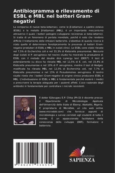 La comparsa di nuove beta-lattamasi, come le ¿-lattamasi a spettro esteso (ESBL) e le metallo ¿-lattamasi (MBL), è un importante meccanismo attraverso il quale i batteri patogeni sviluppano resistenza ai beta-lattamici. Si tratta di un fenomeno di portata mondiale, poiché è noto che rendono difficile il trattamento delle infezioni batteriche. L'obiettivo di questa ricerca è stato quello di determinare fenotipicamente la presenza di batteri Gram-negativi produttori di ESBL e MBL in isolati clinici. Le ESBL sono state rilevate nel 7,5% di Escherichia coli e nel 33,3% di Klebsiella pneumoniae. Nessuno degli isolati di P. aeruginosa nel nostro studio ha mostrato la produzione di ESBL con il metodo del double disk synergy test (DDST). Il test di potenziamento su disco ha rilevato MBL nel 12,5% di E. coli, nel 15,4% di Klebsiella pneumoniae e nel 10% di P. aeruginosa, mentre il test di Hodges modificato ha rilevato MBL nel 12,5% di Escherichia coli, nel 7,7% di Klebsiella pneumoniae e nel 15% di Pseudomonas aeruginosa. Il nostro studio rivela che i batteri Gram-negativi di origine clinica producono ESBL e MBL. L'individuazione di ESBL e MBL è fondamentale perché aiuterà i medici a prescrivere la terapia adeguata per i pazienti affetti. L'uso razionale degli antibiotici è fondamentale per controllare i microbi resistenti.