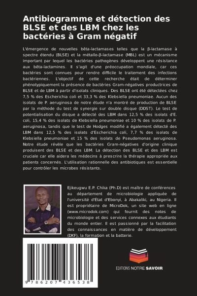 L'émergence de nouvelles bêta-lactamases telles que la beta-lactamase à spectre étendu (BLSE) et la métallo-beta-lactamase (MBL) est un mécanisme important par lequel les bactéries pathogènes développent une résistance aux bêta-lactamines. Il s'agit d'une préoccupation mondiale, car ces bactéries sont connues pour rendre difficile le traitement des infections bactériennes. L'objectif de cette recherche était de déterminer phénotypiquement la présence de bactéries Gram-négatives productrices de BLSE et de LBM à partir d'isolats cliniques. Des BLSE ont été détectées chez 7,5 % des Escherichia coli et 33,3 % des Klebsiella pneumoniae. Aucun des isolats de P. aeruginosa de notre étude n'a montré de production de BLSE par la méthode du test de synergie sur double disque (DDST). Le test de potentialisation du disque a détecté des LBM dans 12,5 % des isolats d'E. coli, 15,4 % des isolats de Klebsiella pneumoniae et 10 % des isolats de P. aeruginosa, tandis que le test de Hodges modifié a également détecté des LBM dans 12,5 % des isolats d'Escherichia coli, 7,7 % des isolats de Klebsiella pneumoniae et 15 % des isolats de Pseudomonas aeruginosa. Notre étude révèle que les bactéries Gram-négatives d'origine clinique produisent des BLSE et des LBM. La détection des BLSE et des LBM est cruciale car elle aidera les médecins à prescrire la thérapie appropriée aux patients concernés. L'utilisation rationnelle des antibiotiques est essentielle pour contrôler les microbes résistants.
