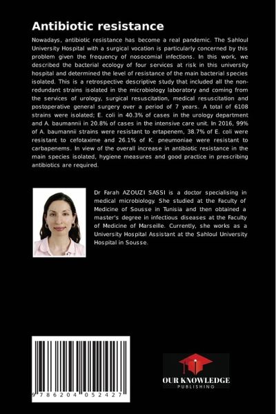 Nowadays, antibiotic resistance has become a real pandemic. The Sahloul University Hospital with a surgical vocation is particularly concerned by this problem given the frequency of nosocomial infections. In this work, we described the bacterial ecology of four services at risk in this university hospital and determined the level of resistance of the main bacterial species isolated. This is a retrospective descriptive study that included all the non-redundant strains isolated in the microbiology laboratory and coming from the services of urology, surgical resuscitation, medical resuscitation and postoperative general surgery over a period of 7 years. A total of 6108 strains were isolated; E. coli in 40.3% of cases in the urology department and A. baumannii in 20.8% of cases in the intensive care unit. In 2016, 99% of A. baumannii strains were resistant to ertapenem, 38.7% of E. coli were resistant to cefotaxime and 26.1% of K. pneumoniae were resistant to carbapenems. In view of the overall increase in antibiotic resistance in the main species isolated, hygiene measures and good practice in prescribing antibiotics are required.