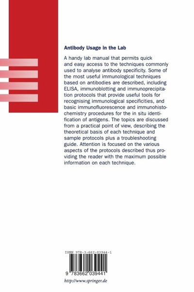 A handy lab manual that permits quick and easy access to the techniques commonly used to analyse antibody specificity. Some of the most useful immunological techniques based on antibodies are described, including ELISA, immunoblotting and immunoprecipitation protocols that provide useful tools for recognising immunological specificities, and basic immunofluorescence and immunohistochemistry procedures for the in situ identification of antigens. The topics are discussed from a practical point of view, describing the theoretical basis of each technique and sample protocols plus a troubleshooting guide. Attention is focused on the various aspects of the protocols described thus providing the reader with the maximum possible information on each technique.