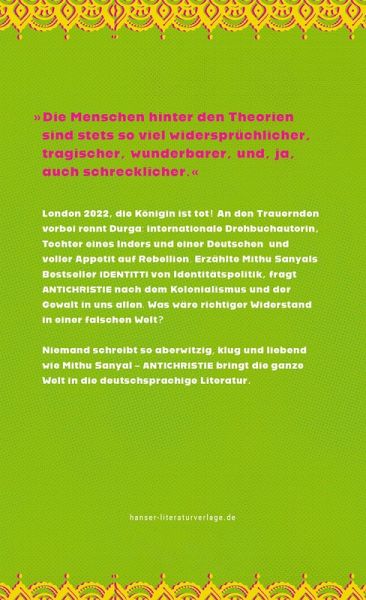 "Ein vergleichbares postkoloniales Roman-Schwergewicht mit Dutzenden realhistorischen, hierzulande kaum bekannten, aber unablässig redenden und streitenden Besserwissern hat es in der deutschen Literatur noch nicht gegeben." Iris Radisch, Die Zeit, 12.9.24 "Wie Mithu Sanyal Gandhi hier als gar nicht so sympathische Figur zeichnet, wie sie an die Wurzel von Freiheitskampf und Terrorismus geht, ist elektrisierend. Durgas Zeitreise im Körper eines Mannes ist erotisch, witzig und gleichzeitig von Trauer durchsetzt.... Brillant." Peter Helling, NDR Kultur, 16.09.24 "Sanyal sprudelt über vor Erzähllaune und wartet mit turbulenten Dialogen auf ... Ein Zeitreiseroman, der die Debatten unserer Tage mit einer gescheiten Geschichte über den Widerstandsgeist von heute und gestern kurzschließt." Shirin Sojitrawalla, taz, 21.09.24 "Antichristie" möchte im Regal offenkundig eher neben Salman Rushdies die Vorgeschichte der Unabhängigkeitserklärung Indiens magisch umreißendem Roman "Mitternachtskinder" und Zadie Smiths "Betrug" ... stehen als bei der viel braveren deutschsprachigen Prosa." Marie Schmidt, Süddeutsche Zeitung, 28.9.24 ",Antichristie' ist wild. Faszinierend, lustig und tragisch. So anspielungsreich, dass einem der Kopf rauscht, und ungeheuer informativ." Silvia Feist, Emotion, November 2024 "Mithu Sanyals Roman 'Antichristie' spielt mit Zeitreisen, thematisiert Kolonialismus, irischen Freiheitskampf, Rassismus, Sexismus und Frauenrecht und ist gleichzeitig witzig." Karin S. Wozoning, Die Presse, 14.09.24 "´Antichristie` bereichert das Sprechen über Herkunft fernab von weißer, biodeutscher Identität, weil nicht nur Gefühle wie Verlust und Trauer verhandelt werden, sondern die Vielschichtigkeit und Mehrdeutigkeit dieser Identitäten." Marlen Hobrack, Der Freitag, 11.10.24 "Man kann sich mit 'Antichristie' auf ein wildes Abenteuer freuen, in dem scheinbar alles möglich ist. Zumindest fast alles." Michaela Pichler, ORF, FM4, 06.11.24 »Ein großes Vergnügen. Ein Roman, der auf allen Ebenen eine wirkliche literarische Erfahrung bietet. Für alle, die gerne vielschichtige Romane lesen und sich für den Kolonialismus interessieren.« Denis Scheck, WDR2, 10.11.24 »Niemand kann Debatten und Ideologien so herrlich in lebendige Erzählungen verwandeln wie Mithu Sanyal.« Volker Weidermann, ZEIT, 21.11.24 »Ein Pageturner, der zeigt, wie gegenwärtig Geschichte sein kann.« Franziska Hirsbrunner, SRF, BuchZeichen, 19.11.24