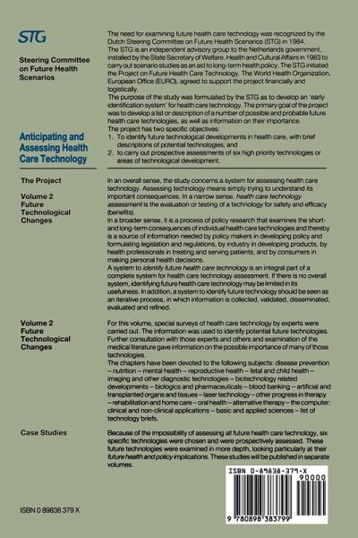 I - Introduction.- Why analyze future health care technology?.- Technological change in health care.- A system for identifying future health care technology.- A system for health care technology assessment.- The specific technologies.- Organization of this report.- II - Disease prevention and health promotion.- Life-styles.- Self-care.- Social and psychological supports.- Screening.- Vaccines.- Social implications.- Conclusion.- III - Nutrition.- Promoting a healthy diet.- Screening and surveillance.- Diagnosis.- Treatment.- Social implications.- Conclusion.- IV - The brain, behavior, and mental health.- Prevention.- Diagnosis.- Psychologically-oriented therapy.- Drugs.- Regeneration of central nervous tissue.- Social implications.- Conclusion.- V - Reproductive health.- Contraception.- Treatment for infertility.- Improved knowledge of reproductive endocrinology.- Social implications.- Conclusion.- VI - Fetal and child health.- Primary prevention of infant morbidity and mortality.- Prenatal screening.- Fetal and neonatal health.- Child health.- Social implications.- Conclusion.- VII - Medical imaging and other diagnostic technologies.- Magnetic Resonance Imaging (MRI).- Positron Emission Tomography (PET).- Digitalization.- Biosensors.- Other diagnostic technologies.- Social implications.- Conclusion.- VIII - Biotechnology-related developments.- Monoclonal antibodies.- Genetic diagnosis and screening.- Home diagnostic kits.- Vaccines.- Pharmaceuticals.- Gene therapy.- Miscellaneous biotechnology-related.- Social implications.- Conclusion.- IX - Biologies and pharmaceuticals.- Biotechnology-related developments.- Other developments.- Delivery systems.- Social implications.- Conclusion.- X - Blood banking.- Biotechnology-related changes.- Bloodsubstitutes.- Pheresis technology.- Automation and computerization.- Blood collection and storage.- Social implications.- Conclusion.- XI - Artificial and transplanted organs and tissues.- Transplanted organs and tissues.- Artificial organs and tissues.- Social implications.- Conclusion.- XII - Laser technology.- Research applications.- Applications in diagnosis.- Applications in therapy.- Social implications.- Conclusion.- XIII - Other progress in therapy.- Operating room instrumentation.- Anesthesia.- Intensive care.- Wound healing.- Radiotherapy.- Extracorporeal shock wave lithotripsy.- Ventilation equipment (for assisting breathing).- Bone growth stimulation.- Social implications.- Conclusion.- XIV - Rehabilitation and home care.- Rehabilitation.- Geriatric rehabilitation.- Prosthetics and robotics.- Technologies for support in the home.- Social implications.- Conclusion.- XV - Oral health.- Prevention of dental caries.- Diagnosis and treatment of dental caries.- Prevention and treatment of peridontal disease.- Implanted teeth.- Social implications.- Conclusion.- XVI - Alternative therapy.- Homeopathy and other forms of energy medicine.- Manipulation, osteopathy and chiropractic.- Nutrition.- Affecting psychosomatic balance through the mind.- Social implications.- Conclusion.- XVII - The computer: clinical applications.- Computer-assisted diagnosis.- Therapeutic protocols.- Artificial intelligence.- Social implications.- Conclusion.- XVIII - The computer: organizational and analytical applications.- The computerized medical record.- Organizational and financial.- Monitoring and networking.- Epidemiology and analysis.- Education.- Information for the public.- Social implications.- Conclusion.- XIX - Basic and applied sciences.- Molecular biology.-Biochemistry and cell biology.- Immunology.- Materials science.- Micro-electronics.- Social implications.- Conclusion.- Appendixes.- A. Method of the project.- B. Other responses to the survey.- C. Acknowledgements.- D. Glossary of terms.- E. References.