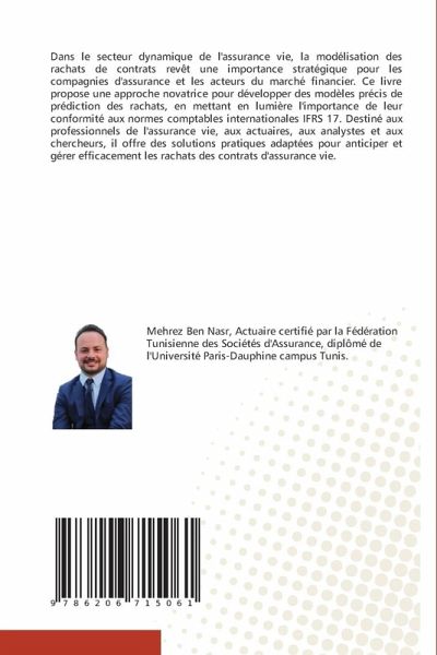 Dans le secteur dynamique de l'assurance vie, la modélisation des rachats de contrats revêt une importance stratégique pour les compagnies d'assurance et les acteurs du marché financier. Ce livre propose une approche novatrice pour développer des modèles précis de prédiction des rachats, en mettant en lumière l'importance de leur conformité aux normes comptables internationales IFRS 17. Destiné aux professionnels de l'assurance vie, aux actuaires, aux analystes et aux chercheurs, il offre des solutions pratiques adaptées pour anticiper et gérer efficacement les rachats des contrats d'assurance vie.
