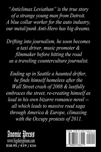"Anticlimax Leviathan" is the true story of a strange young man from Detroit. A blue collar worker for the auto industry, our metal/punk Anti-Hero has big dreams. Breaking into journalism, he soon becomes a taxi driver, music promoter & filmmaker before hitting the road as a traveling counterculture journalist. Ending up in Seattle a haunted drifter, he finds himself homeless after the Wall Street crash of 2008 & lustfully embraces "the street," re-creating himself as lead in his own bizarre punk rock romance novel. Along the way he meets a legion of "street crazies" whom unite to form a global movement called "Free Therapy." Together they build a new world from the ashes of their ghost lives, all which leads to a massive road saga through America & Europe -- climaxing with the Occupy protests of 2011.