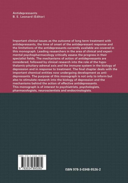 Important clinical issues as the outcome of long term treatment with antidepressants, the time of onset of the antidepressant response and the limitations of the antidepressants currently available are covered in this monograph. Leading researchers in the area of clinical and experimental psychopharmacology critically assess the progress in their specialist fields. The mechanisms of action of antidepressants are considered, followed by clinical research into the role of the hypothalamic-pituitary-adrenal axis and the immune system in the biology of depression and in response to treatment. The final chapter deals with the important chemical entities now undergoing development as antidepressants. The purpose of this monograph is not only to inform but also to stimulate research into the biology of depression and the mechanisms behind the action of effective antidepressants. This monograph is of interest to psychiatrists, psychologists, pharmacologists, neuroscientists and endocrinologists.