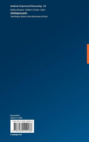 Part 1: Overview and General Principles.- 1. Impact, Diagnosis, Phenomenology, and Biology.- Part 2: The Past - from antiquity to 1970 including TCAs and MAOIs.- 2. Tricyclic Antidepressants and Monoamine Oxidase Inhibitors: Are They Too Old for a New Look?.- Part 3: The Present- 1970 to 2016.- 3. Clinical Implications of the STAR*D Trial.- 4. Pharmacogenomics and Biomarkers of Depression.- 5. Therapeutic Drug Monitoring of Antidepressants.- 6. Selective Serotonin Reuptake Inhibitors.- 7. Serotonin and Norepinephrine Reuptake Inhibitors.- 8. Neurostimulation Therapies.- 9. Current Role of Herbal and Natural Preparations.- Part 4: The future.- 10. Role of Inflammation in Depression and Treatment Implications.- 11. NMDA Antagonists for Treatment-Resistant Depression.- 12. Drug Development in Psychiatry: The Long and Winding Road from Chance Discovery to Rational Development.- 13. Other Antidepressants.- Part 5: Use of Antidepressants in Special Populations.- 14. Use of Antidepressants in Patients with Co-occurring Depression and Substance Use Disorders.- 15. Treatment of Depression in Women.- 16. Management of Late-Life Depression.- 17. The Use of Antidepressants in Bipolar Depression.