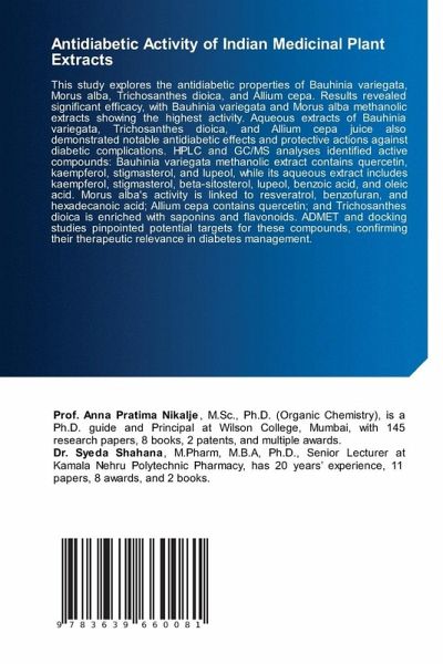 This study explores the antidiabetic properties of Bauhinia variegata, Morus alba, Trichosanthes dioica, and Allium cepa. Results revealed significant efficacy, with Bauhinia variegata and Morus alba methanolic extracts showing the highest activity. Aqueous extracts of Bauhinia variegata, Trichosanthes dioica, and Allium cepa juice also demonstrated notable antidiabetic effects and protective actions against diabetic complications. HPLC and GC/MS analyses identified active compounds: Bauhinia variegata methanolic extract contains quercetin, kaempferol, stigmasterol, and lupeol, while its…mehr