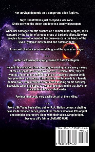Her survival depends on a dangerous alien fugitive. Skye Chantrell has just escaped a war zone. She's carrying the stolen antidote to a deadly bioweapon. When her damaged shuttle crashes on a remote lunar outpost, she's captured by the leader of a rogue group of barbaric aliens. Now her people's fate-not to mention her own-rests in the hands of the Seven Systems' most feared and hated criminal. A man with the face of a brutal thug, and the eyes of an angel. * * * Hunter Tarthasian has every reason to hate the Regime. He and his comrades have gone rogue, vowing to use every means at their disposal to bring down the evil Premiere. Now, they're wanted and on the run, holed up in an abandoned outpost while they plan their next move. The last thing Hunter needs is a female human civvy with a terrible secret crash-landing on his doorstep. Especially when she starts to awaken feelings in him that have no place in his life as a rebel leader. Feelings that could very easily get all of them killed. * * * From USA Today bestselling author R. A. Steffan comes a sizzling new sci-fi romance series with heat, heart, and edge-of-your-seat action. Strap in tight, because all's fair in LOVE AND WAR.