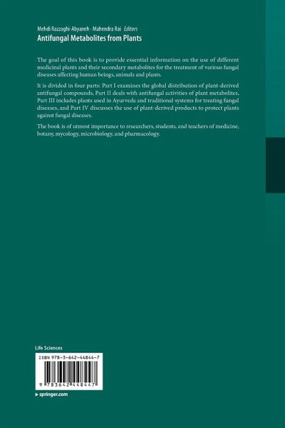 The goal of this book is to provide essential information on the use of different medicinal plants and their secondary metabolites for the treatment of various fungal diseases affecting human beings, animals and plants. It is divided in four parts: Part I examines the global distribution of plant-derived antifungal compounds, Part II deals with antifungal activities of plant metabolites, Part III includes plants used in Ayurveda and traditional systems for treating fungal diseases, and Part IV discusses the use of plant-derived products to protect plants against fungal diseases.