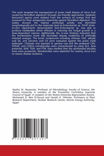 This work targeted the management of green mold disease of citrus fruit caused by Penicillium digitatum through eco-friendly approaches. Epiphytic biocontrol agents were isolated from the surfaces of orange fruit and screened for their antagonistic bioactivity against Penicillium digitatum. The isolate showed the highest antifungal activity was identified morphologically and to the molecular level as Enterobacter sp. SH-87 strain. In-vitro experiments demonstrated that Enterobacter sp. was able to produce metabolites which efficient in reducing the fungal growth in a dose-dependent manner. Additionally, the in-vivo findings indicated that the fermentation broth (FB) decreased disease incidences of artificially infected oranges. The broth compounds including chitosan CHS, salicylic acid SA, and cinnamic acid CA were evaluated against the green mold pathogen. Chitosan was exposed to gamma rays and the prepared CHS, CHSSA, and CHSCA nanobiocides were characterized by using DLS, Zetapotential, SEM, TEM, and FTIR. Data clarified that the synthesized biocides have nano properties. Nanobiocides were exploited for coating citrus fruit to reduce disease incidence.