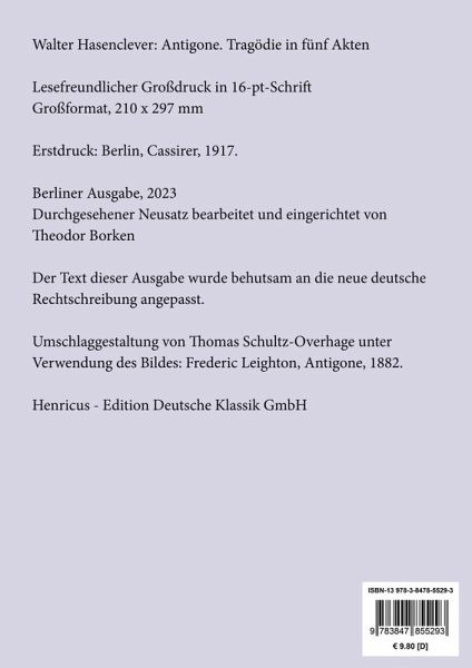 Walter Hasenclever: Antigone. Tragödie in fünf AktenLesefreundlicher Großdruck in 16-pt-SchriftGroßformat, 210 x 297 mmBerliner Ausgabe, 2023Durchgesehener Neusatz bearbeitet und eingerichtet von Theodor BorkenErstdruck: Berlin, Cassirer, 1917.Der Text dieser Ausgabe wurde behutsam an die neue deutsche Rechtschreibung angepasst.Umschlagabbildung: Frederic Leighton, Antigone, 1882Gesetzt aus der Minion Pro, 16 pt.Henricus - Edition Deutsche Klassik GmbH