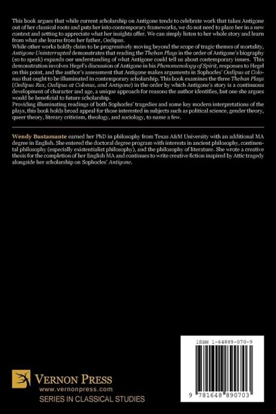This book argues that while current scholarship on Antigone tends to celebrate work that takes Antigone out of her classical roots and puts her into contemporary frameworks, we do not need to place her in a new context and setting to appreciate what her insights offer. We can simply listen to her whole story and learn from what she learns from her father, Oedipus. While other works boldly claim to be progressively moving beyond the scope of tragic themes of mortality, Antigone Uninterrupted demonstrates that reading the Theban Plays in the order of Antigone’s biography (so to speak) expands our understanding of what Antigone could tell us about contemporary issues. This demonstration involves Hegel’s discussion of Antigone in his Phenomenology of Spirit, responses to Hegel on this point, and the author’s assessment that Antigone makes arguments in Sophocles’ Oedipus at Colonus that ought to be illuminated in contemporary scholarship. This book examines the three Theban Plays (Oedipus Rex, Oedipus at Colonus, and Antigone) in the order by which Antigone’s story is a continuous development of character and age, a unique approach for reasons the author identifies, but one she argues would be beneficial to future scholarship. Providing illuminating readings of both Sophocles’ tragedies and some key modern interpretations of the plays, this book holds broad appeal for those interested in subjects such as political science, gender theory, queer theory, literary criticism, theology, and sociology, to name a few.