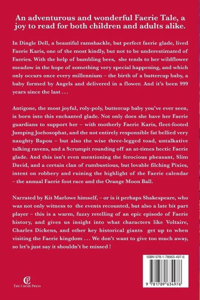 An adventurous and wonderful Faerie Tale, a joy to read for both children and adults alike. In Dingle Dell, a beautiful ramshackle, but perfect faerie glade, lived Faerie Karis, one of the most kindly, but not to be underestimated of Faeries. With the help of bumbling bees, she tends to her wildflower meadow in the hope of something very special happening, and which only occurs once every millennium - the birth of a buttercup baby, a baby formed by Angels and delivered in a flower. And it's been 999 years since the last ... Antigone, the most joyful, roly-poly, buttercup baby you've ever seen, is born into this enchanted glade. Not only does she have her Faerie guardians to support her - with motherly Faerie Karis, fleet-footed Jumping Joehosophat, and the not entirely responsible fat bellied very naughty Bapou - but also the wise three-legged toad, untalkative talking ravens, and a Scrumpit rounding off an at-times hectic Faerie glade. And this isn't even mentioning the ferocious pheasant, Slim David, and a certain clan of rumbustious, but lovable filching Pixies, intent on robbery and ruining the highlight of the Faerie calendar - the annual Faerie foot race and the Orange Moon Ball. Narrated by Kit Marlowe himself, - or is it perhaps Shakespeare, who was not only witness to the events recounted, but also a late bit part player - this is a warm, fuzzy retelling of an epic episode of Faerie history, and gives us insight into what characters like Voltaire, Charles Dickens, and other key historical giants get up to when visiting the Faerie kingdom ... We don't want to give too much away, so let's just say it shouldn't be missed !