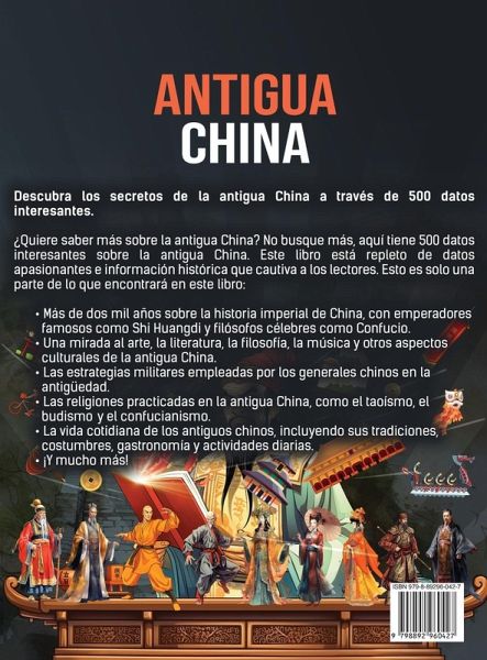 Descubra los secretos de la antigua China a través de 500 datos interesantes. ¿Quiere saber más sobre la antigua China? No busque más, aquí tiene 500 datos interesantes sobre la antigua China. Este libro está repleto de datos apasionantes e información histórica que cautiva a los lectores. Esto es solo una parte de lo que encontrará en este libro: Más de dos mil años sobre la historia imperial de China, con emperadores famosos como Shi Huangdi y filósofos célebres como Confucio. Una mirada al arte, la literatura, la filosofía, la música y otros aspectos culturales de la antigua China. Las estrategias militares empleadas por los generales chinos en la antigüedad. Las religiones practicadas en la antigua China, como el taoísmo, el budismo y el confucianismo. La vida cotidiana de los antiguos chinos, incluyendo sus tradiciones, costumbres, gastronomía y actividades diarias. ¡Y mucho más! Este libro es un viaje inolvidable a una de las civilizaciones más fascinantes de la historia de la humanidad. No lo dude, descubra ahora los secretos de la antigua China a través de 500 datos interesantes sobre la antigua China.