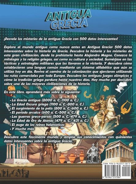 ¡Desvele los misterios de la antigua Grecia con 500 datos interesantes! Explore el mundo antiguo como nunca antes en Antigua Grecia: 500 datos interesantes sobre la historia de Grecia. Descubra la historia y los misterios de esta gran civilización, desde la prehistoria hasta Alejandro Magno. Conozca la mitología y la religión griegas, así como su cultura y sociedad. Sumérjase en las tácticas y estrategias militares que los llevaron a la victoria. Y descubra cómo establecieron una lengua común mediante un sistema alfabético que aún se utiliza hoy en día. Reviva el camino de la colonización que ejercieron utilizando las rutas comerciales por toda Europa. Descubra los antiguos juegos olímpicos y cómo la tradición griega perdura hasta nuestros días. Hay mucho por descubrir sobre una de las mayores civilizaciones de la historia. En este libro, aprenderá más sobre lo siguiente: La Grecia antigua (8000 a. C.-1100 a. C.) La Edad Oscura griega (1100 a. C.-800 a. C.) El surgimiento de la polis (800 a. C.-600 a. C.) El periodo arcaico (600 a. C.-500 a. C.) Las guerras greco-persas (500 a. C.-479 a. C.) La Edad de Oro de Atenas (479 a. C.- 431 a. C.) El auge de los reinos helenísticos Y mucho más Descubra este fascinante mundo y amplíe sus conocimientos con quinientos datos interesantes sobre la antigua Grecia.