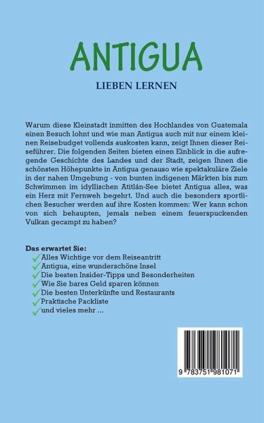 Warum diese Kleinstadt inmitten des Hochlandes von Guatemala einen Besuch lohnt und wie man Antigua auch mit nur einem kleinen Reisebudget vollends auskosten kann, zeigt Ihnen dieser Reiseführer. Die folgenden Seiten bieten einen Einblick in die aufregende Geschichte des Landes und der Stadt, zeigen Ihnen die schönsten Höhepunkte in Antigua genauso wie spektakuläre Ziele in der nahen Umgebung - von bunten indigenen Märkten bis zum Schwimmen im idyllischen Atitlán-See bietet Antigua alles, was ein Herz mit Fernweh begehrt. Und auch die besonders sportlichen Besucher werden auf ihre Kosten kommen: Wer kann schon von sich behaupten, jemals neben einem feuerspuckenden Vulkan gecampt zu haben?Das erwartet Sie:-Alles Wichtige vor dem Reiseantritt-Antigua, eine wunderschöne Insel-Die besten Insider-Tipps und Besonderheiten-Wie Sie bares Geld sparen können-Die besten Unterkünfte und Restaurants-Praktische Packliste-und vieles mehr ...