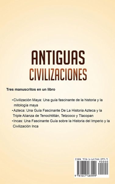 Explore la cautivadora historia y mitología de tres civilizaciones antiguas Tres manuscritos en un libro Civilización Maya: Una guía fascinante de la historia y la mitología maya Azteca: Una Guía Fascinante De La Historia Azteca y la Triple Alianza de Tenochtitlán, Tetzcoco y Tlacopan Incas: Una Fascinante Guía sobre la Historia del Imperio y la Civilización Inca Algunos de los temas y preguntas cubiertos en la primera parte de este libro incluyen: Línea de tiempo maya Glosario de los términos mayas más importantes Los orígenes de las civilizaciones mesoamericanas El periodo Arcaico: 7000 – 2000 a.C. Los olmecas: 1200 – 300 a.C. El periodo Preclásico y la espléndida zapoteca Periodo Preclásico Temprano: 2000 a 1000 a.C. Cuello y la arquitectura maya primitiva Periodo Preclásico Medio: 1000 a 300 a.C. Los zapotecas: 600 a.C. a 800 d.C. Periodo Preclásico Tardío: 300 a.C. a 250 d.C. El periodo Clásico, el calendario del fin del mundo y el misterio de la Reina Roja Clásico Temprano – 250 a 600 d.C. Cómo medían el tiempo los mayas Clásico Tardío – 600 Clásico Tardío – 600 a 900 d.C. El misterio de la Reina Roja Clásico Terminal – 900 a 1000 d.C. Comida, rituales e historias espantosas Cómo hacer un chocolate maya caliente en casa ¿Cómo cultivaban sus alimentos los mayas? El dios del maíz Los estándares de belleza mayas El sagrado juego de la pelota El declive de la civilización maya y el sacrificio humano Posclásico Temprano – 1000 a 1250 d.C. Dentro de Chichén Itzá – características de las ciudades mayas El observatorio maya (El Caracol) El sacrificio humano y sus métodos La pirámide Kukulkán Periodo Posclásico Tardío y la conquista española ¡Y mucho má Algunos de los temas y preguntas cubiertos en la segunda parte de este libro incluyen: Los Orígenes de los Aztecas: Una Tribu Destinada a la Grandeza La Llegada No Deseada al Valle de México El Ascenso de Tenochtitlán y la Triple Alianza Los Reyes Aztecas Más Grandes y su Herencia El Esplendor de Tenochtitlán Algunos de los temas y preguntas cubiertos en la tercera parte de este libro incluyen: Cómo Registraban su Historia los Incas El Mito Inca de la Creación La Fundación de la Gran Ciudad de Cuzco La Primer Dinastía de Gobernantes Incas y sus Mayores Obras El surgimiento del Imperio Inca: ¿Un Evento Cosmológico? Orden Social en la Sociedad Inca El Orden Religioso e Ideología Inca Recorrido por los Sitios Incas más Importantes esde Pachacuti hasta la Llegada de los Españoles La Conquista Española Las Repercusiones y el Legado Inca ¡Y mucho más que no querrás perderte!