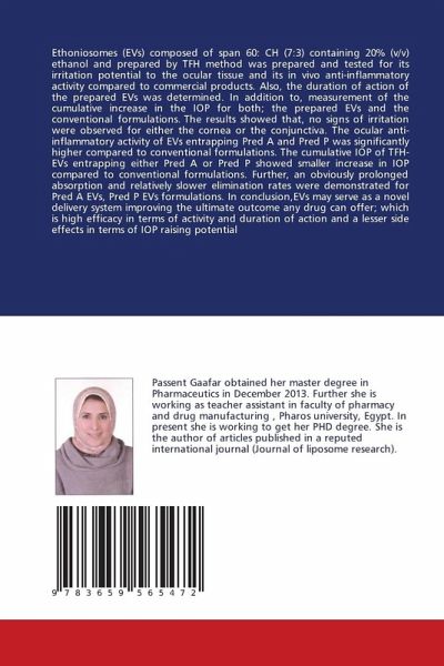 Ethoniosomes (EVs) composed of span 60: CH (7:3) containing 20% (v/v) ethanol and prepared by TFH method was prepared and tested for its irritation potential to the ocular tissue and its in vivo anti-inflammatory activity compared to commercial products. Also, the duration of action of the prepared EVs was determined. In addition to, measurement of the cumulative increase in the IOP for both; the prepared EVs and the conventional formulations. The results showed that, no signs of irritation were observed for either the cornea or the conjunctiva. The ocular anti-inflammatory activity of EVs entrapping Pred A and Pred P was significantly higher compared to conventional formulations. The cumulative IOP of TFH-EVs entrapping either Pred A or Pred P showed smaller increase in IOP compared to conventional formulations. Further, an obviously prolonged absorption and relatively slower elimination rates were demonstrated for Pred A EVs, Pred P EVs formulations. In conclusion,EVs may serveas a novel delivery system improving the ultimate outcome any drug can offer; which is high efficacy in terms of activity and duration of action and a lesser side effects in terms of IOP raising potential
