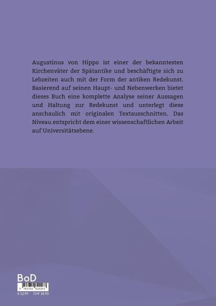 Augustinus von Hippo ist einer der bekanntesten Kirchenväter der Spätantike und beschäftigte sich zu Lebzeiten auch mit der Form der antiken Redekunst. Basierend auf seinen Haupt- und Nebenwerken bietet dieses Buch eine komplette Analyse seiner Aussagen und Haltung zur Redekunst und unterlegt diese anschaulich mit originalen Textausschnitten. Das Niveau entspricht dem einer wissenschaftlichen Arbeit auf Universitätsebene.