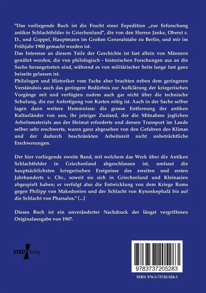 Der hier vorliegende zweite Band, mit welchem das Werk über die Antiken Schlachtfelder in Griechenland abgeschlossen ist, umfasst die hauptsächlichsten kriegerischen Ereignisse des zweiten und ersten Jahrhunderts v. Chr., soweit sie sich in Griechenland und Kleinasien abgespielt haben; er verfolgt also die Entwicklung von dem Kriege Roms gegen Philipp von Makedonien und der Schlacht von Kynoskephalä bis auf die Schlacht von Pharsalos." [...]