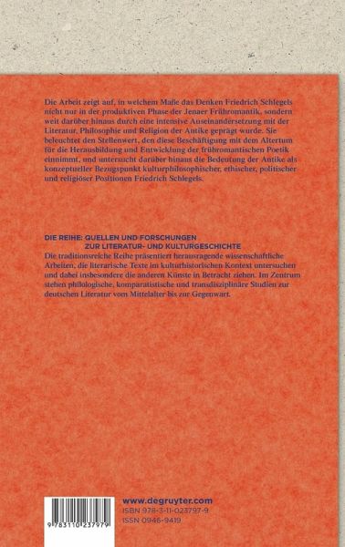 The work shows the extent to which the thinking of Friedrich Schlegel was characterized by an intense examination of the literature, philosophy and religion of the ancient world? not only in the productive phase of Jena Romanticism, but far beyond that. It highlights the significance of this preoccupation with antiquity for the creation and development of early Romantic poetics and explores the importance of antiquity as a conceptual reference point for the cultural-philosophical, ethical, political and religious positions of Friedrich Schlegel.