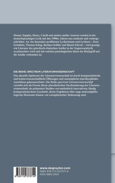 Homer, Sappho, Horace, Catullus, and other authors of antiquity have enjoyed a rebirth in German-speaking lyric poetry since the 1990s. Examining the work of four particularly notable poets – Durs Grünbein, Thomas Kling, Barbara Köhler, and Raoul Schrott – this book illuminates how classical antiquity is presented anew in contemporary lyric poetry, and sheds light on the ideas that are connected to this rediscovery of the Greek and Roman past.