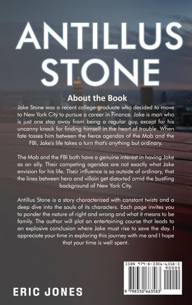 Jake Stone was a recent college graduate who decided to move to New York City to pursue a career in Finance. Jake is man who is just one step away from being a regular guy, except for his uncanny knack for finding himself in the heart of trouble. When fate tosses him between the fierce agendas of the Mob and the FBI, Jake's life takes a turn that's anything but ordinary. The Mob and the FBI both have a genuine interest in having Jake as an ally. Their competing agendas are not exactly what Jake envision for his life. Their influence is so outside of ordinary, that the lines between hero and villain get distorted amid the bustling background of New York City. Antillus Stone is a story characterized with constant twists and a deep dive into the souls of its characters. Each page invites you to ponder the nature of right and wrong and what it means to be family. The author will plot an entertaining course that leads to an explosive conclusion where Jake must rise to save the day. I appreciate your time in exploring this journey with me and I hope that your time is well spent.