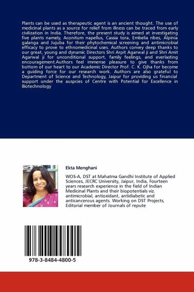 Plants can be used as therapeutic agent is an ancient thought. The use of medicinal plants as a source for relief from illness can be traced from early civilization in India. Therefore, the present study is aimed at investigating five plants namely, Aconitum napellus, Cassia tora, Embelia ribes, Alpinia galanga and Jujuba for their phytochemical screening and antimicrobial efficacy to prove to ethnomedicinal uses. Authors convey deep thanks to our great, young and dynamic Directors Shri Arpit Agarwal ji and Shri Amit Agarwal ji for unconditional support, family feelings, and everlasting encouragement.Authors feel immense pleasure to give thanks from bottom of our heart to our Academic Director Prof. C. K. Ojha for become a guiding force for our research work. Authors are also grateful to Department of Science and Technology, Jaipur for providing us financial support under the auspcies of Centre with Potential for Excellence in Biotechnology