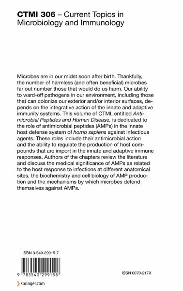 Microbes are in our midst soon after birth. Thankfully, the number of harmless (and often beneficial) microbes far outnumber those that would do us harm. Our ability to ward-off pathogens in our environment, including those that can colonize our exterior and/or interior surfaces, depends on the integrative action of the innate and adaptive immunity systems. This volume of CTMI, entitled Antimicrobial Peptides and Human Disease, is dedicated to the role of antimicrobial peptides (AMPs) in the innate host defense system of homo sapiens.