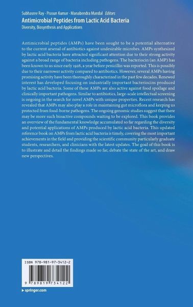 Chapter 1 Lactic acid bacteria Taxonomy, characteristic features, physiology, and diversity.- Chapter 2 Classification of AMPs and their mode of action.- Chapter 3 Metabolic Engineering of Lactic Acid Bacteria for Antimicrobial Peptides Production.- Chapter 4 Classification, Prediction and Potential Applications of Bacteriocins.- Chapter 5 Bacteriocins and bacteriocin like compounds synthesized by lactic acid bacteria.- Chapter 6 Extremophiles as a source of antimicrobial peptides.- Chapter 7 Recovery and purification techniques used for AMPs produced by Lactic Acid Bacteria.- Chapter 8 Purification and characterisation of an infantaricin a bacteriocin with antilisterial activity produced by Streptococcus infantarius isolated from pozol.- Chapter 9 Antimicrobial peptides and their applications.- Chapter 10 Application of AMPs in the food and beverage industry.- Chapter 11 Biomedical applications of antimicrobial peptides produced by Lactic Acid Bacteria.- Chapter 12 Role of antimicrobial peptides in agriculture and industries.- Chapter 13 Antimicrobial peptides from lactic acid bacteria as a hurdle technology component for food preservation applications and safety considerations.