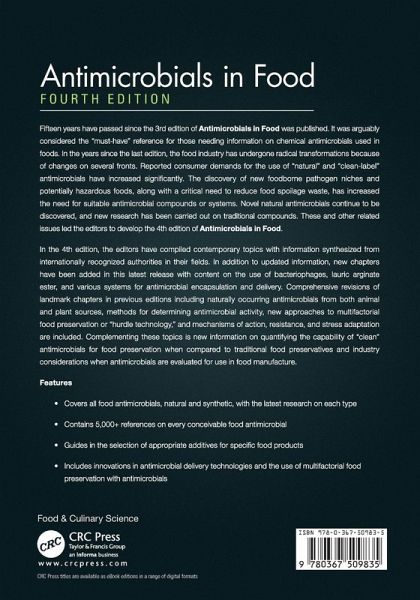 Fifteen years have passed since the 3rd edition of Antimicrobials in Food was published. It was arguably considered the "must-have" reference for those needing information on chemical antimicrobials used in foods. In the years since the last edition, the food industry has undergone radical transformations because of changes on several fronts. Reported consumer demands for the use of "natural" and "clean-label" antimicrobials have increased significantly. The discovery of new foodborne pathogen niches and potentially hazardous foods, along with a critical need to reduce food spoilage waste, has increased the need for suitable antimicrobial compounds or systems. Novel natural antimicrobials continue to be discovered, and new research has been carried out on traditional compounds. These and other related issues led the editors to develop the 4th edition of Antimicrobials in Food.