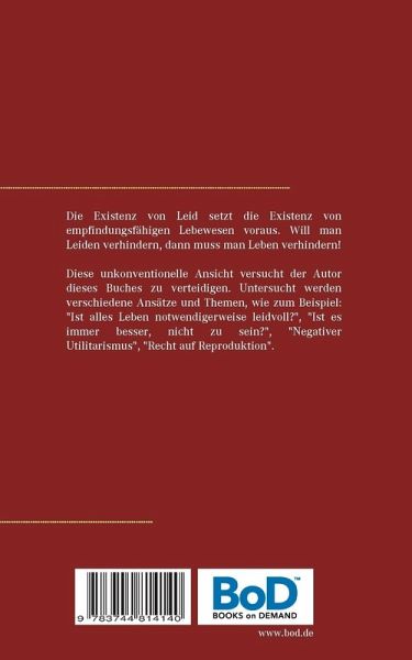 Die Existenz von Leid setzt die Existenz von empfindungsfähigen Lebewesen voraus. Will man Leiden verhindern, dann muss man Leben verhindern!Diese unkonventionelle Ansicht versucht der Autor dieses Buches zu verteidigen. Untersucht werden verschiedene Ansätze und Themen, wie zum Beispiel: "Ist alles Leben notwendigerweise leidvoll?", "Ist es immer besser, nicht zu sein?", "Negativer Utilitarismus", "Recht auf Reproduktion".