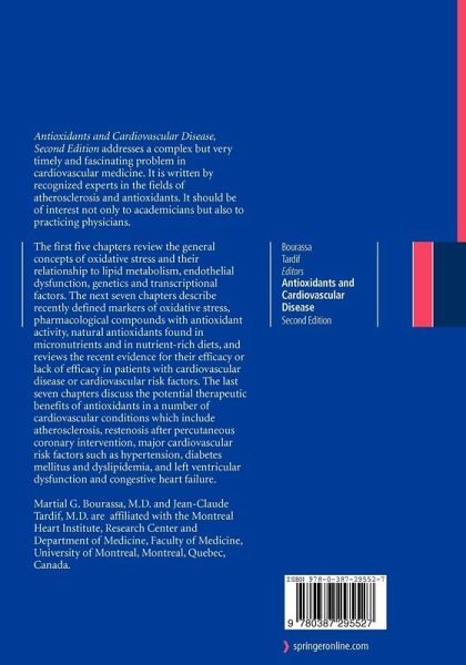 Antioxidants and Cardiovascular Disease, Second Edition addresses a complex but very timely and fascinating problem in cardiovascular medicine. It is written by recognized experts in the fields of atherosclerosis and antioxidants. It should be of interest not only to academicians but also to practicing physicians. The first five chapters review the general concepts of oxidative stress and their relationship to lipid metabolism, endothelial dysfunction, genetics and transcriptional factors. The next seven chapters describe recently defined markers of oxidative stress, pharmacological compounds with antioxidant activity, natural antioxidants found in micronutrients and in nutrient-rich diets, and reviews the recent evidence for their efficacy or lack of efficacy in patients with cardiovascular disease or cardiovascular risk factors. The last seven chapters discuss the potential therapeutic benefits of antioxidants in a number of cardiovascular conditions which include atherosclerosis, restenosis after percutaneous coronary intervention, major cardiovascular risk factors such as hypertension, diabetes mellitus and dyslipidemia, and left ventricular dysfunction and congestive heart failure.