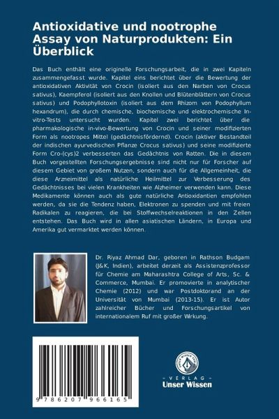 Das Buch enthält eine originelle Forschungsarbeit, die in zwei Kapiteln zusammengefasst wurde. Kapitel eins berichtet über die Bewertung der antioxidativen Aktivität von Crocin (isoliert aus den Narben von Crocus sativus), Kaempferol (isoliert aus den Knollen und Blütenblättern von Crocus sativus) und Podophyllotoxin (isoliert aus dem Rhizom von Podophyllum hexandrum), die durch chemische, biochemische und elektrochemische In-vitro-Tests untersucht wurden. Kapitel zwei berichtet über die pharmakologische in-vivo-Bewertung von Crocin und seiner modifizierten Form als nootropes Mittel (gedächtnisfördernd). Crocin (aktiver Bestandteil der indischen ayurvedischen Pflanze Crocus sativus) und seine modifizierte Form Cro-(cys)2 verbesserten das Gedächtnis von Ratten. Die in diesem Buch vorgestellten Forschungsergebnisse sind nicht nur für Forscher auf diesem Gebiet von großem Nutzen, sondern auch für die Allgemeinheit, die diese Arzneimittel als natürliche Heilmittel zur Verbesserung des Gedächtnisses bei vielen Krankheiten wie Alzheimer verwenden kann. Diese Medikamente können auch als gute natürliche Antioxidantien empfohlen werden, da sie die Tendenz haben, Elektronen zu spenden und mit freien Radikalen zu reagieren, die bei Stoffwechselreaktionen in den Zellen entstehen. Das Buch wird in allen asiatischen Ländern, in Europa und Amerika gut vermarktet werden können.