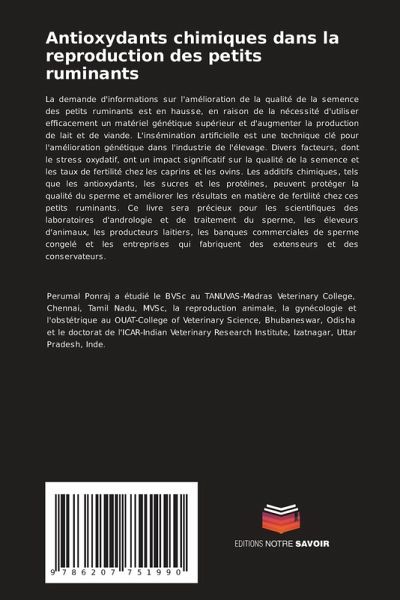 La demande d'informations sur l'amélioration de la qualité de la semence des petits ruminants est en hausse, en raison de la nécessité d'utiliser efficacement un matériel génétique supérieur et d'augmenter la production de lait et de viande. L'insémination artificielle est une technique clé pour l'amélioration génétique dans l'industrie de l'élevage. Divers facteurs, dont le stress oxydatif, ont un impact significatif sur la qualité de la semence et les taux de fertilité chez les caprins et les ovins. Les additifs chimiques, tels que les antioxydants, les sucres et les protéines, peuvent protéger la qualité du sperme et améliorer les résultats en matière de fertilité chez ces petits ruminants. Ce livre sera précieux pour les scientifiques des laboratoires d'andrologie et de traitement du sperme, les éleveurs d'animaux, les producteurs laitiers, les banques commerciales de sperme congelé et les entreprises qui fabriquent des extenseurs et des conservateurs.