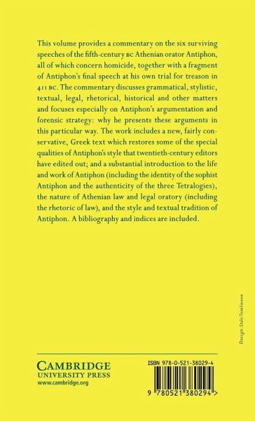 This volume provides a commentary on the six surviving speeches of the fifth-century BC Athenian orator Antiphon, all of which concern homicide, together with a fragment of Antiphon's final speech at his own trial for treason in 411 BC. The commentary discusses grammatical, stylistic, textual, legal, rhetorical, historical and other matters and focuses especially on Antiphon's argumentation and forensic strategy: why he presents these arguments in this particular way. The work includes a new, fairly conservative, Greek text which restores some of the special qualities of Antiphon's style that twentieth-century editors have edited out; and a substantial introduction to the life and work of Antiphon (including the identity of the sophist Antiphon and the authenticity of the three Tetralogies), the nature of Athenian law and legal oratory (including the rhetoric of law), and the style and textual tradition of Antiphon. A bibliography and indices are included.