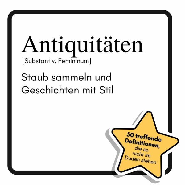 Wer glaubt, Antiquitäten seien nur verstaubte Relikte, hat "Antiquitäten: Staub sammeln und Geschichten mit Stil" noch nicht erlebt! Hier werden Apothekerschränke zu Zeitmaschinen, Standuhren zu Geschichtenerzählern und Perserteppiche zu Laufstegen für Fantasie. 50 legendäre Objekte, von der Tiffany-Lampe bis zum Flohmarktfuchs, werden mit Witz und Charme neu definiert - und jede Definition bekommt ihre eigene, liebevoll gezeichnete Illustration.Für wen dieses Buch optimal geeignet ist:- Für Sammler mit Humor und Sinn für das Besondere- Für alle, die Antiquitäten lieben, aber keine staubtrockene Lektüre wollen- Für Geschenkjäger auf der Suche nach originellen IdeenEin Buch, das zeigt, wie viel Leben, Skurrilität und Stil in alten Dingen steckt. Perfekt für alle, die Geschichten hinter dem Staub entdecken wollen.Was beim Kauf dieses Buches erwartet werden kann:- 50 humorvolle Definitionen von Antiquitäten und Sammlerstücken- Passende Illustrationen zu jedem Eintrag- Ein originelles Geschenk für Liebhaber alter Schätze- Ein unterhaltsamer Blick auf die Welt der Antiquitäten