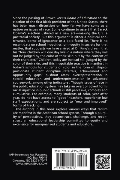 Since the passing of Brown versus Board of Education to the election of the first Black president of the United States, there has been much discussion on how far we have come as a nation on issues of race. Some continue to assert that Barack Obama's election ushered in a new era-making the US a post-racial society. But this argument is either a political contrivance, borne of ignorance or a bold-faced lie. There is no recent data on school inequities, or inequity in society for that matter, that suggests we have arrived at Dr. King's dream that his "four children will one day live in a nation where they will not be judged by the color of their skin but by the content of their character." Children today are instead still judged by the color of their skin, and this inequitable practice is manifest in today's schools for students of color in the form of: disproportionate student discipline referrals, achievement and opportunity gaps, pushout rates, overrepresentation in special education and underrepresentation in advanced coursework, among other indicators (Brooks, 2012). Though issues of race in the public education system may take an overt or covert form; racial injustice in public schools is still pervasive, complex and cumulative. For example, many students of color, year after year, do not have access to "good" teachers, experience low staff expectations, and are subject to "new and improved" forms of tracking (Brooks, Arnold & Brooks, in press). The authors in this book explore various ways that racism are manifest in the American school system. Through a plurality of perspectives, they deconstruct, challenge and reconstruct an educational leadership committed to equity and excellence for marginalized students and educators.