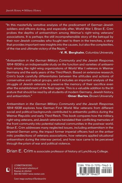 Antisemitism in the German Military Community and the Jewish Response, 1914-1938 explores how German World War I veterans from different social and political backgrounds contributed to antisemitic politics during the Weimar Republic. The book compares how the military, right-wing veterans, and Jewish veterans chose to remember their war experiences and translate these memories into a political reality in the postwar world. Antisemitism addresses several neglected issues. First, there is relatively little scholarship discussing antisemitism in the imperial German army and the impact former imperial officers had on the antisemitic predilections of veteran associations. This subject deserves attention given that veteran politics during the Weimar Republic were of tremendous significance to the collapse of democracy and the rise of National Socialism, and that the primary architects of the Third Reich and the "Final Solution" were either World War I veterans or had been members of paramilitary organizations in the interwar period. The second issue addressed is how veterans influenced the definition of "Aryan" identity, or how race came to be perceived through the prism of war and political violence. Since German Jews had to fight both accusations of shirking military service and the perception of the "Jew" as effeminate, the manner in which these veterans tried to reforge Jewish identity and their relationship with their former comrades is an extraordinarily important issue. The third issue concerns situational antisemitism, or the process by which an organization expressed an opinion or policy concerning Jews in response to internal dissension and external influences.
