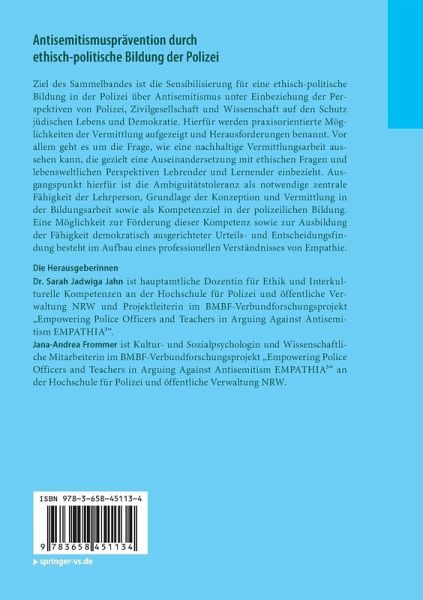 Ziel des Sammelbandes ist die Sensibilisierung für eine ethisch-politische Bildung in der Polizei über Antisemitismus unter Einbeziehung der Perspektiven von Polizei, Zivilgesellschaft und Wissenschaft auf den Schutz jüdischen Lebens und Demokratie. Hierfür werden praxisorientierte Möglichkeiten der Vermittlung aufgezeigt und Herausforderungen benannt. Vor allem geht es um die Frage, wie eine nachhaltige Vermittlungsarbeit aussehen kann, die gezielt eine Auseinandersetzung mit ethischen Fragen und lebensweltlichen Perspektiven Lehrender und Lernender einbezieht. Ausgangspunkt hierfür ist die Ambiguitätstoleranz als notwendige zentrale Fähigkeit der Lehrperson, Grundlage der Konzeption und Vermittlung in der Bildungsarbeit sowie als Kompetenzziel in der polizeilichen Bildung. Eine Möglichkeit zur Förderung dieser Kompetenz sowie zur Ausbildung der Fähigkeit demokratisch ausgerichteter Urteils- und Entscheidungsfindung besteht im Aufbau eines professionellen Verständnisses von Empathie.