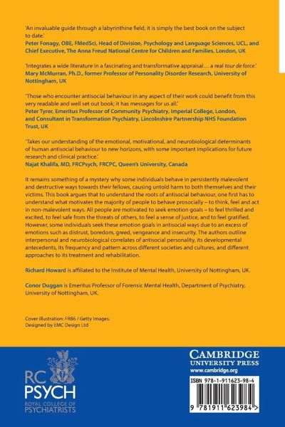 It remains something of a mystery why some individuals behave in persistently malevolent and destructive ways towards their fellows, causing untold harm both to themselves and their victims. This book argues that to understand the roots of antisocial behaviour, one first has to understand what motivates the majority of people to behave prosocially - to think, feel and act in non-malevolent ways. All people are motivated to seek emotion goals - to feel thrilled and excited, to feel safe from the threats of others, to feel a sense of justice, and to feel gratified. However some individuals seek these emotion goals in antisocial ways due to an excess of emotions such as distrust, boredom, greed, vengeance and insecurity. The authors outline interpersonal and neurobiological correlates of antisocial personality, its developmental antecedents, its frequency and pattern across different societies and cultures, and different approaches to its treatment and rehabilitation.