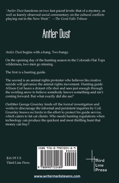 Antler Dust begins with a bang. Two bangs. On the opening day of the hunting season in the Colorado Flat Tops wilderness, two men go missing. The first is a hunting guide. The second is a protester who believes his creative suicide will galvanize the animal rights movement.Hunting guide Allison Coil hears a distant rifle shot and sees just enough through the swirling snow to believe somebody knows something-and isn't coming forward. But what exactly did she see? Outfitter George Grumley blunts the formal investigation and works to discourage the persistent inquiries by Coil. Grumley knows no limits in the effort to protect his guide service, which caters to a swank clientele. Who needs hunting regulations when technology can produce the quickest and most thrilling hunt that money can buy?