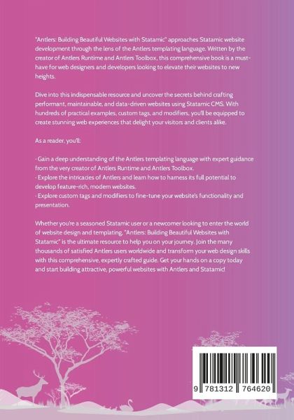 "Antlers: Building Beautiful Websites with Statamic" approaches Statamic website development through the lens of the Antlers templating language. Written by the creator of Antlers Runtime and Antlers Toolbox, this comprehensive book is a must-have for web designers and developers looking to elevate their websites to new heights. Dive into this indispensable resource and uncover the secrets behind crafting performant, maintainable, and data-driven websites using Statamic. With hundreds of practical examples, custom tags, and modifiers, you'll be equipped to create stunning web experiences that delight your visitors and clients alike. As a reader, you'll: - Gain a deep understanding of the Antlers templating language with expert guidance from the very creator of Antlers Runtime and Antlers Toolbox. - Explore the intricacies of Antlers and learn how to harness its full potential to develop feature-rich, modern websites. - Explore custom tags and modifiers to fine-tune your website's functionality and presentation. Whether you're a seasoned Statamic CMS user or a newcomer looking to enter the world of website design and templating, "Antlers: Building Beautiful Websites with Statamic" is the ultimate resource to help you on your journey. Join the many thousands of satisfied Antlers users worldwide and transform your web design skills with this comprehensive, expertly crafted guide. Get your hands on a copy today and start building attractive, powerful websites with Antlers and Statamic!